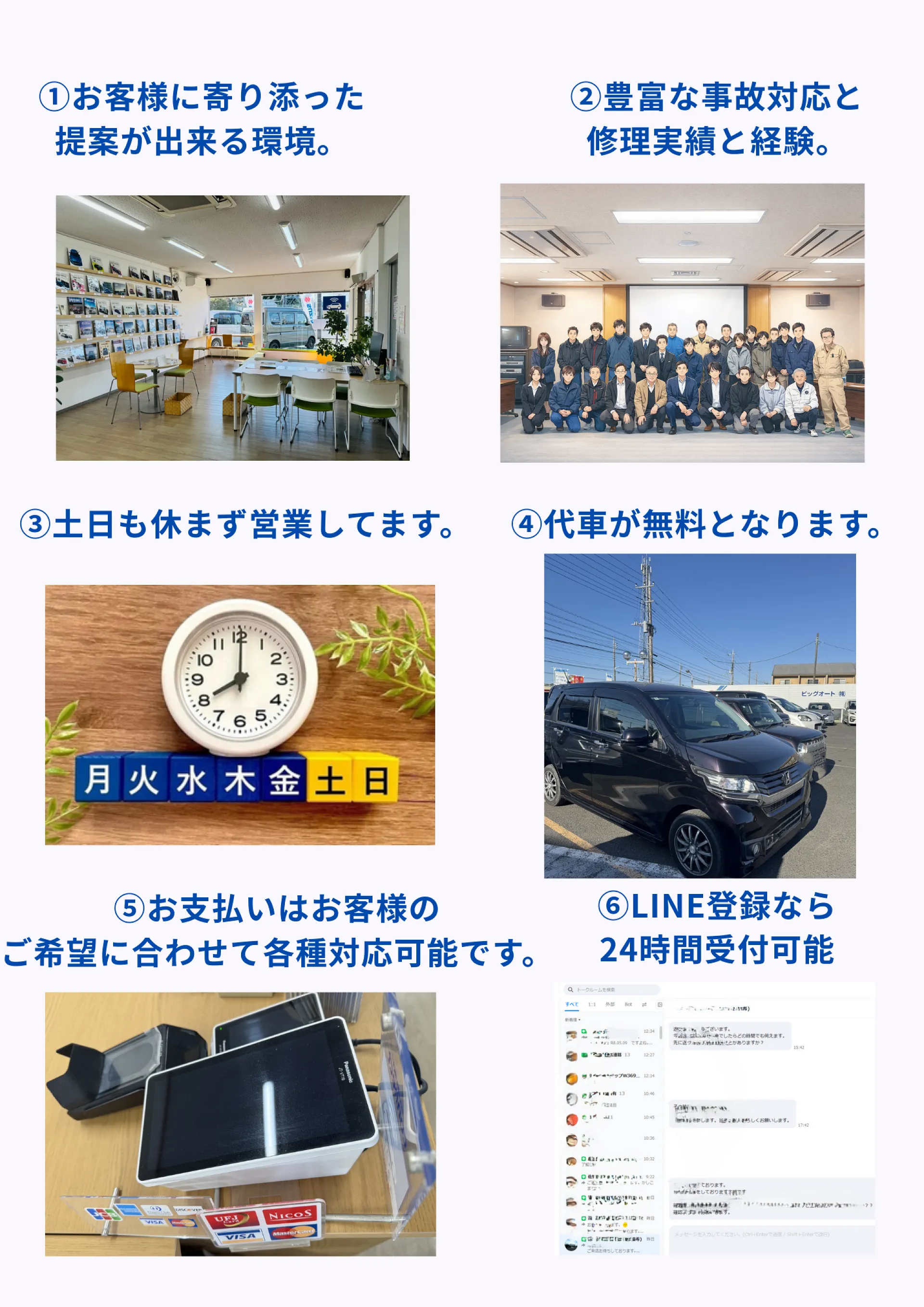 店舗紹介当社LINE友だち登録頂くとご来店前に簡易見積も可能となります。損傷写真と車検証のお写真を頂ければ、概算になりますがお見積りも可能となります!